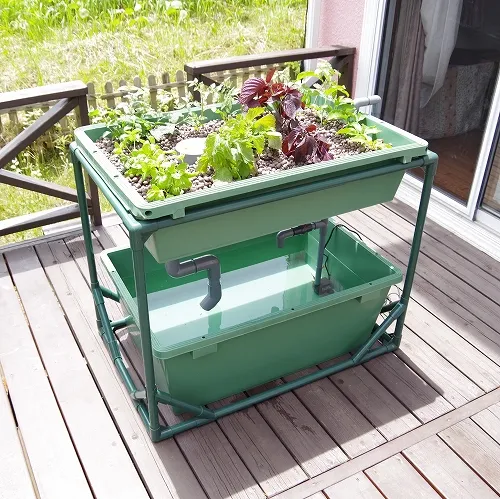 中型タイプで野菜もたっぷり収穫できるアクアポニックスキット、お庭やベランダ、学校や介護施設に手間いらずで安心して導入できます。
