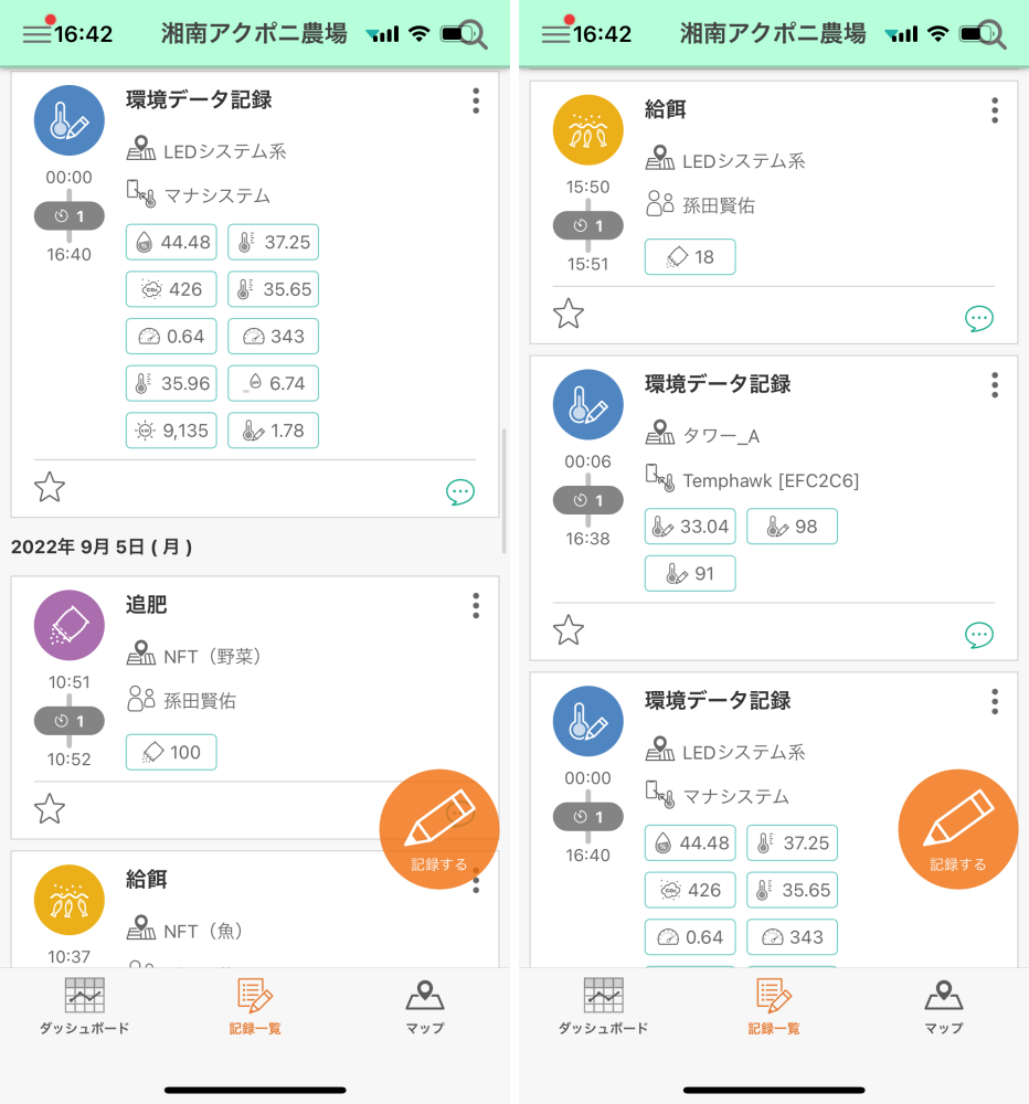 作業内容(給餌、施肥、定植、収穫、水質検査、生育状態等)に加え、IoTセンサーによって気温、水温、湿度、pH、EC、溶存酸素、塩分濃度など最大10項目の環境データを自動取得し、クラウド上に蓄積できる。これにより、従来は熟練者の経験や勘に頼っていた判断を、数値に基づく科学的な管理へと転換することが可能となった。